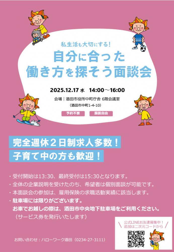 12/17 酒田市中町庁舎 にて行われる「自分に合った働き方を探そう面談会」に参加します 2025/12/16 2025年12月17日酒田市中町庁舎 にて行われる「自分に合った働き方を探そう面談会」に参加いたします! この機会に、ぜひ弊社について知っていただければ幸いです! 山形・庄内地方で就職を考えている皆さま、ご参加お待ちしております。 参加日:2025年12月17日(水) 14:00〜16:00 開催場所:酒田市役所中町庁舎6階会議室 主催:ハローワーク酒田様 一覧を表示 20252024202320222021202020192018 Tweet